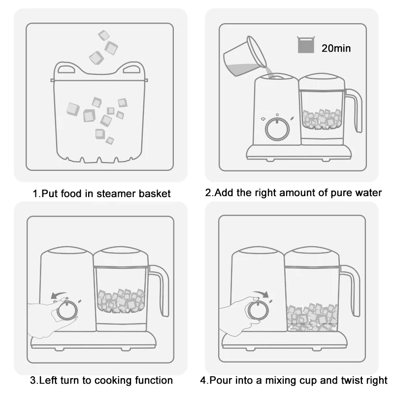 Features: - Powerful functions: steam, agitation, heating and electronic health. -Save time and energy, it only takes 20 minutes! - High precision and fast preparation. Press the button for convenient, quick chopping / puree of fruits, nuts, vegetables. The-pulse-is grounded every 5 seconds. Within 3 rounds you will get a delicious soup. -Convenient to use. It does not make noise, just cooking and storing food in one hand. -Easy to store and clean. All parts can be washed in the dishwasher. -Safe and high-quality food materials, Unbreakable design will help you create health and tranquility to feed your baby.